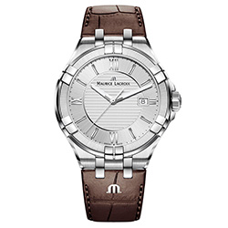 3. Maurice Lacroix Aikon Gents AI1008-SS001-130-1 Корпус из нержавеющей стали с полированной отделкой поверхности, безеля и декоративных звеньев. Серебристый сатинированный циферблат с контрастной отделкой в центре в технике гильоше в виде широких горизонтальных полос: центральные стрелки с алмазной обработкой и родиевым покрытием, люминесцентными вставками на стрелках часов и минут; условные индексы, римские цифры и окошко даты с родиевым покрытием. Коричневый ремешок из телячьей кожи с узором под кожу аллигатора с накладным полированным серебристым логотипом, с двойной раскладывающейся застёжкой из нержавеющей стали на двух кнопках с сатинированной и полированной отделкой и круговым зернением. |