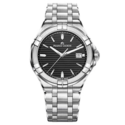 8. Maurice Lacroix Aikon Gents AI1008-SS002-331-1 Корпус из нержавеющей стали с полированной отделкой поверхности, безеля и декоративных звеньев. Чёрный сатинированный циферблат: центральные стрелки с алмазной обработкой и родиевым покрытием, люминесцентными вставками на стрелках часов и минут; условные индексы, римские цифры и окошко даты с родиевым покрытием. Браслет из нержавеющей стали с пятью рядами звеньев с сатинированной и полированной отделкой, с двойной раскладывающейся застёжкой из нержавеющей стали на двух кнопках с сатинированной и полированной отделкой и круговым зернением. |