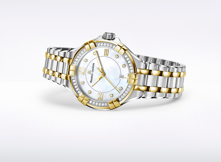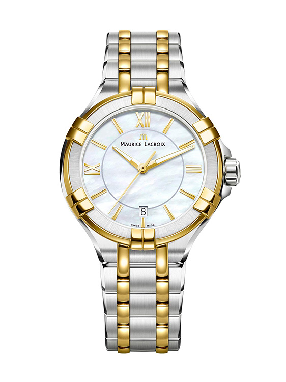 1. Maurice Lacroix Aikon Ladies AI1006-DY503-171-1 Корпус из нержавеющей стали с полированной отделкой поверхности, безеля и декоративных звеньев. Внешняя кромка безеля и декоративные звенья – с жёлто-золотым PVD-покрытием. Безель инкрустирован тридцатью шестью бриллиантами огранки TW, диаметром 1,2 мм и общим весом 0,25 карата. Перламутровый, с голубым оттенком, циферблат: центральные стрелки с PVD-покрытием жёлтым золотом и люминесцирующими вставками на стрелках часов и минут; восемь бриллиантов огранки TW, диаметром 1,2 мм и общим весом 0,05 карата в роли условных индексов, римские цифры с жёлто-золотым PVD-покрытием, окошко даты. Браслет из нержавеющей стали с пятью рядами звеньев из нержавеющей стали с сатинированной и полированной отделкой, чётными рядами звеньев с жёлто-золотым PVD-покрытием, с двойной раскладывающейся застёжкой из нержавеющей стали на двух кнопках с сатинированной и полированной отделкой и круговым зернением. |