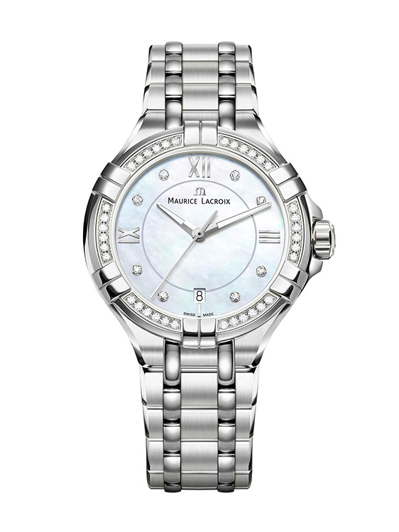 4. Maurice Lacroix Aikon Ladies AI1006-SD502-170-1 Корпус из нержавеющей стали с полированной отделкой поверхности, безеля и декоративных звеньев. Безель инкрустирован тридцатью шестью бриллиантами огранки TW, диаметром 1,2 мм и общим весом 0,25 карата. Перламутровый, с голубым оттенком, циферблат: центральные стрелки с алмазной обработкой, родиевым покрытием и люминесцирующими вставками на стрелках часов и минут; восемь бриллиантов огранки TW, диаметром 1,2 мм и общим весом 0,05 карата в роли условных индексов, римские цифры с родиевым покрытием, окошко даты. Браслет из нержавеющей стали с пятью рядами звеньев из нержавеющей стали с сатинированной и полированной отделкой, с двойной раскладывающейся застёжкой из нержавеющей стали на двух кнопках с сатинированной и полированной отделкой и круговым зернением. |