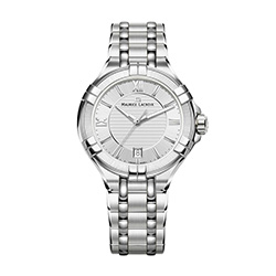 6. Maurice Lacroix Aikon Gents AI1008-SS002-131-1 Корпус из нержавеющей стали с полированной отделкой поверхности, безеля и декоративных звеньев. Серебристый сатинированный циферблат: центральные стрелки с алмазной обработкой и родиевым покрытием, люминесцентными вставками на стрелках часов и минут; условные индексы, римские цифры и окошко даты с родиевым покрытием. Браслет из нержавеющей стали с пятью рядами звеньев с сатинированной и полированной отделкой, с двойной раскладывающейся застёжкой из нержавеющей стали на двух кнопках с сатинированной и полированной отделкой и круговым зернением. |