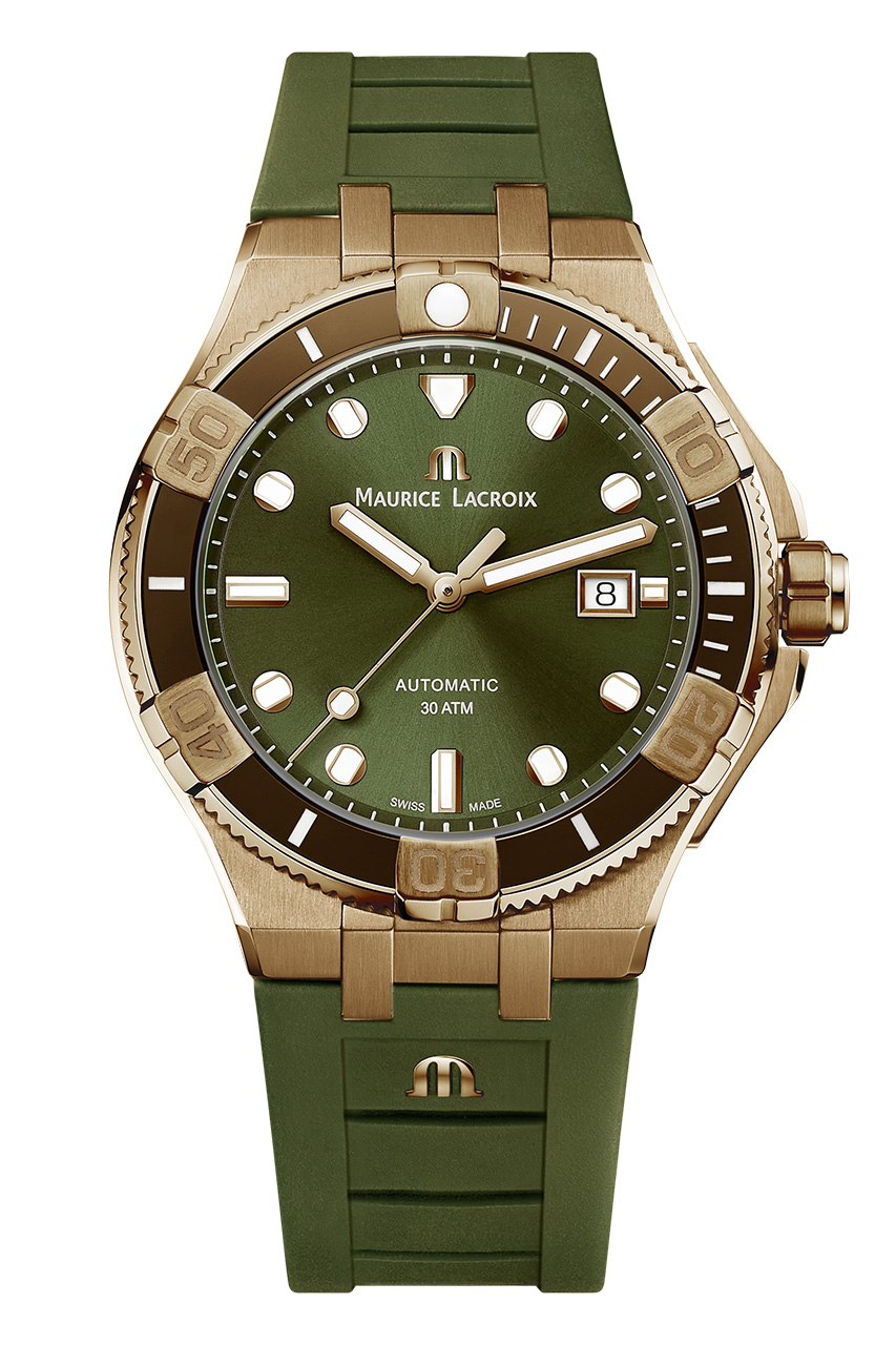 Впервые часы AIKON Venturer выпускаются в бронзе. Корпус диаметром 43 мм выполнен из особого сплава, который с течением времени способен покрываться патиной или темнеть, не разрушаясь при этом. Бронза известна человечеству многие века как самый долговечный материал для изготовления инструментов. Команда разработчиков Maurice Lacroix выбрала этот металл, чтобы подчеркнуть строгую функциональность моделей Venturer, и дополнила новинку подходящим циферблатом насыщенного зеленого цвета с отделкой «солнечные лучи». Гармонию натуральных теплых оттенков продолжает зеленый каучуковый ремешок с геометрическим узором. Благодаря системе Easychange каучуковый ремешок можно легко заменить на винтажный коричневый ремешок из телячьей кожи с бежевой прошивкой. Безель выполнен из коричневой керамики. Выступы на безеле, выполняющие роль часовых меток, выдержаны в стилистике AIKON Venturer. Как и корпус, они изготовлены из бронзы. Данная модель, оснащенная автоматическим механизмом ML 115, выпущена ограниченной серией из 500 экземпляров.