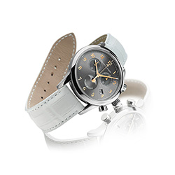 4. Les Classiques Chronographe Phases De Lune Ladies LC1087-SD501-820-1 Корпус из полированной нержавеющей стали с бриллиантовой инкрустацией. Антрацитовый сатинированный циферблат с центральными стрелками, накладными арабскими цифрами и малыми стрелками минут и секунд, покрытыми родием. Белый ремешок из натуральной кожи с раскладывающейся застёжкой из полированной нержавеющей стали. |