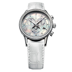 3. Les Classiques Chronographe Phases De Lune Ladies LC1087-SD501-160-1 Корпус из полированной нержавеющей стали с бриллиантовой инкрустацией. Белый перламутровый циферблат с центральными стрелками, малыми стрелками минут и секунд, покрытыми родием и двенадцатью бриллиантами в качестве условных часовых индексов. Белый ремешок из натуральной кожи с раскладывающейся застёжкой из полированной нержавеющей стали. |