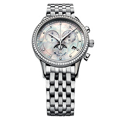 6. Les Classiques Chronographe Phases De Lune Ladies LC1087-SD502-160-1 Корпус из полированной нержавеющей стали с бриллиантовой инкрустацией. Белый перламутровый циферблат с центральными стрелками, малыми стрелками минут и секунд, покрытыми родием и двенадцатью бриллиантами в качестве условных часовых индексов. Браслет из полированной нержавеющей стали с раскладывающейся застёжкой. |