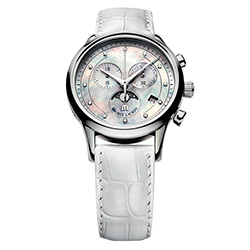 8. Les Classiques Chronographe Phases De Lune Ladies LC1087-SS001-160-1 Корпус из полированной нержавеющей стали. Белый перламутровый циферблат с центральными стрелками, малыми стрелками минут и секунд, покрытыми родием и двенадцатью бриллиантами в качестве условных часовых индексов. Белый ремешок из натуральной кожи с раскладывающейся застёжкой из полированной нержавеющей стали. |
