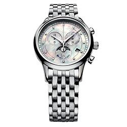 12. Les Classiques Chronographe Phases De Lune Ladies LC1087-SS002-160-1 Корпус и браслет с раскладывающейся застёжкой из полированной нержавеющей стали. Белый перламутровый циферблат с центральными стрелками, малыми стрелками минут и секунд, покрытыми родием и двенадцатью бриллиантами в качестве условных часовых индексов. |