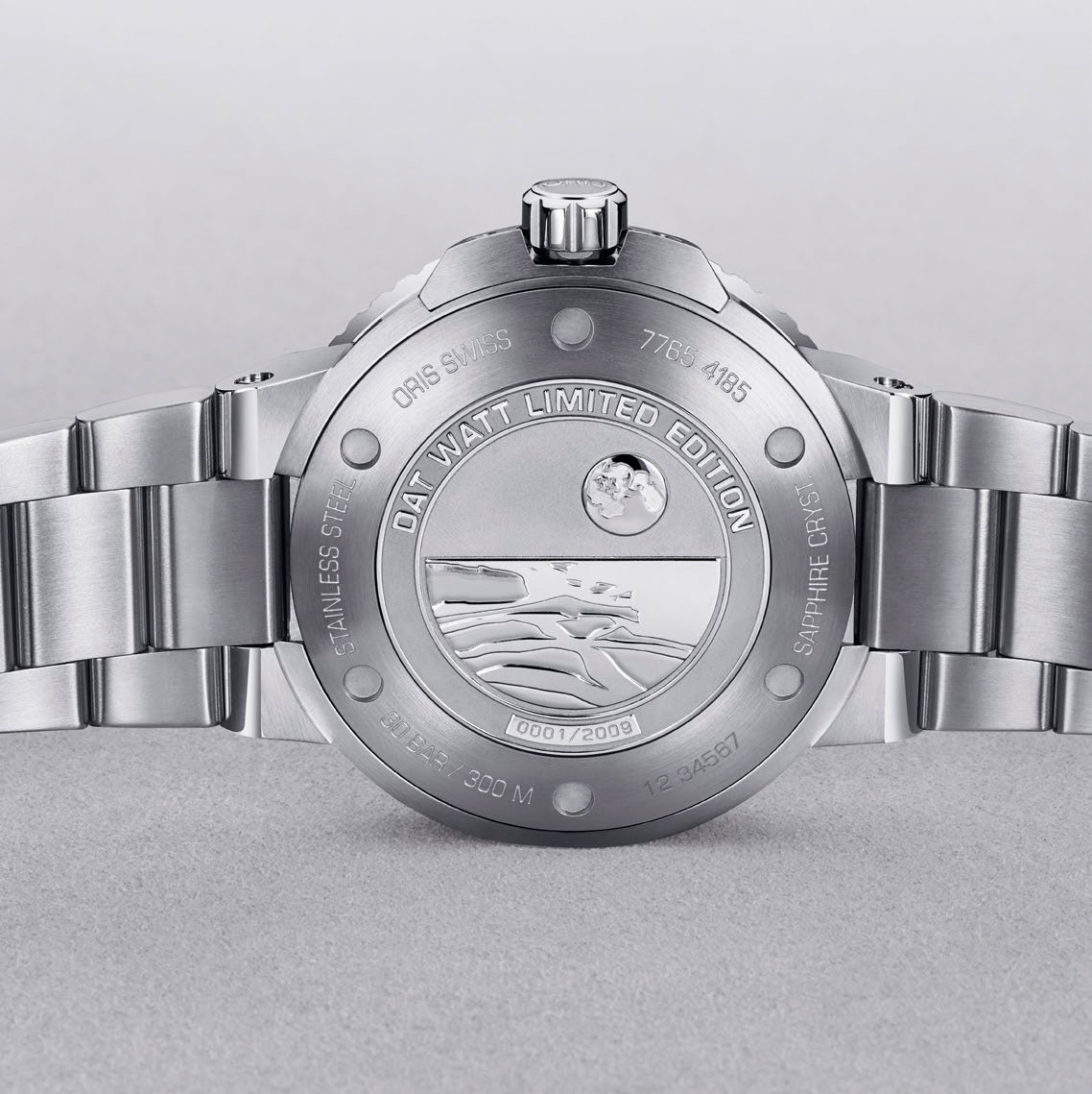 В названии часов Dat Watt Limited Edition отражено как звучит «Ваттовое море» на местном диалекте. Дизайн этой модели создан на основе дайверских часов Oris Aquis. Серия лимитирована 2009 экземплярами – такое количество выбрано в честь года, в котором Ваттовое море было удостоено статуса объекта всемирного наследия ЮНЕСКО. Dat Watt Limited Edition – особенные часы. На их циферблате с помощью функции стрелочной индикации фазы Луны (Pointer Moon) отображаются лунный цикл и диапазон приливов и отливов в Северном полушарии. Эта функция разработана Oris для профессиональных дайверов. Центральная стрелка белого цвета, правильно установленная на 29,5-дневный лунный цикл, показывает соответствующий приливный диапазон по белому контуру на циферблате. Также по этой стрелке определяется прибывающая и убывающая Луна.