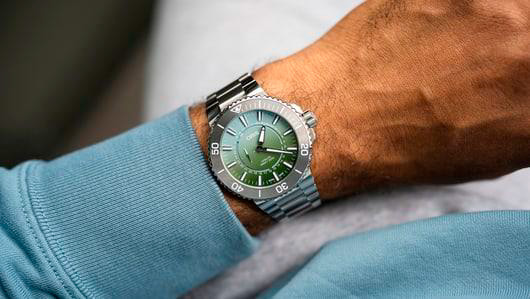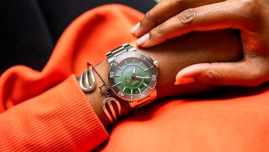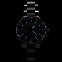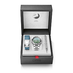 Часы также отличаются необычным круговым указателем даты, который запитывается автоматическим швейцарским механизмом. С их водонепроницаемостью до 30 бар (300 м), часы готовы к любым приключениям в морских глубинах.