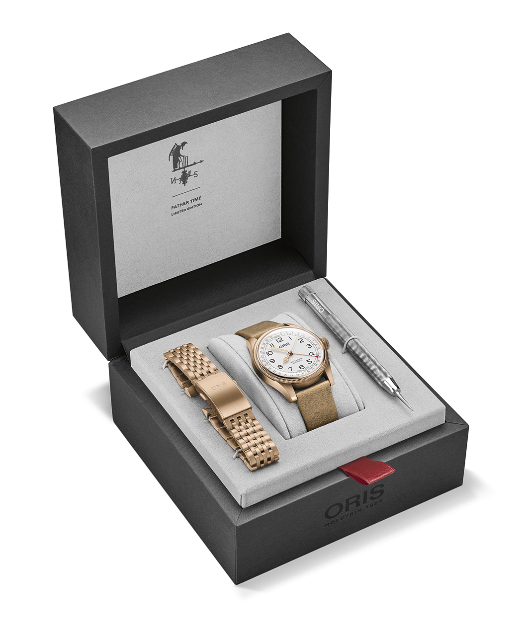 Новая серия часов Father Time Limited Edition создана на базе фирменного дизайна Oris Big Crown Pointer Date, включая увеличенную заводную головку. Корпус диаметром 40 мм, рифленый безель и заводная головка изготовлены из цельной бронзы естественного старения. Каждый часовой механизм Oris 754 в серии Father Time Limited Edition автоматический, оборудован функцией даты и красной стрелкой-полумесяцем.