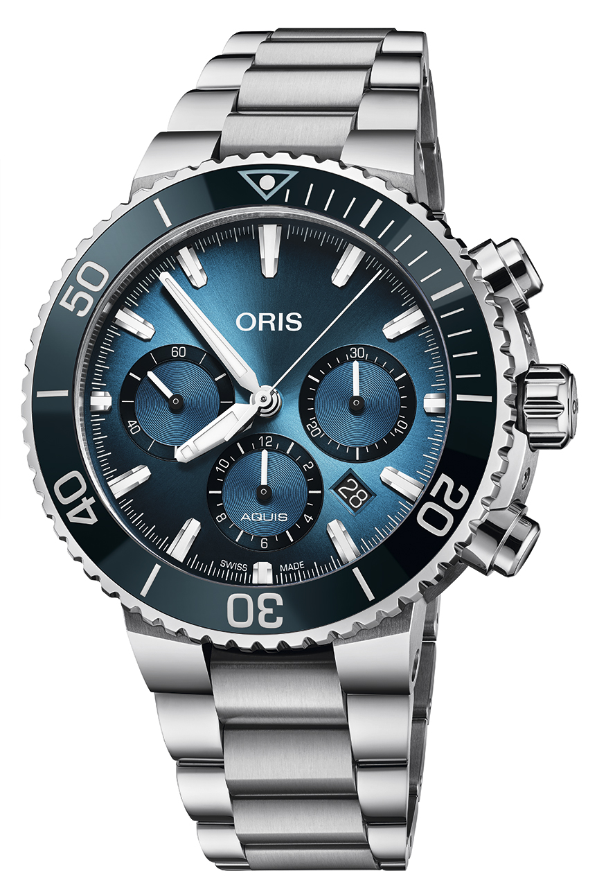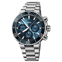 Модель Oris Blue Whale Limited Edition является первым хронографом Aquis с расположением циферблатов на делениях 3, 6 и 9 часов. Новые часы завершают комплект Oris Ocean Trilogy, часть проекта «Океаны» компании Oris.