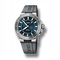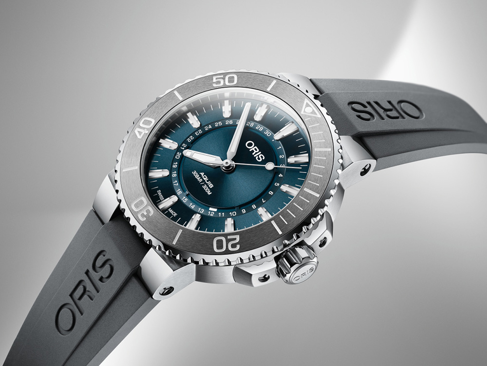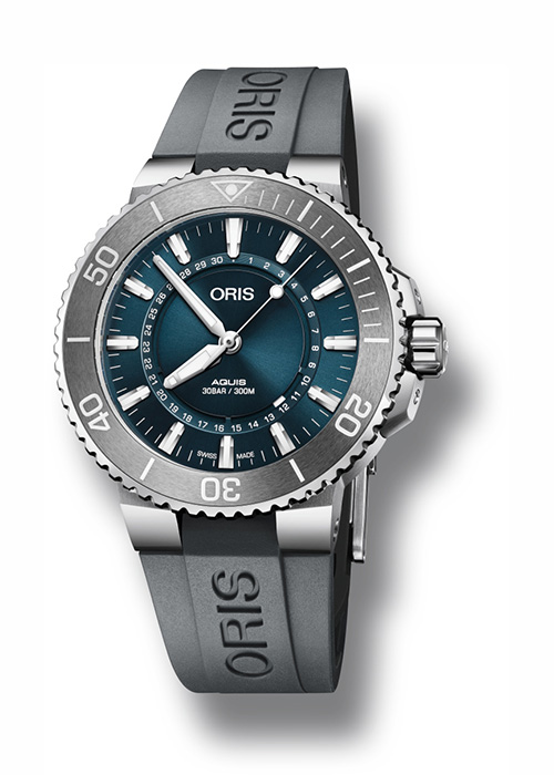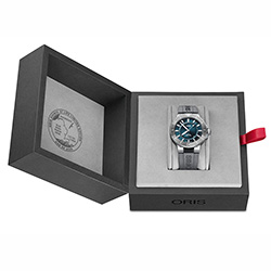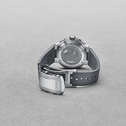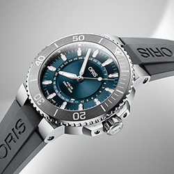 - Серый каучуковый ремешок с разработанным Oris предохранительным якорем, удлинителем и раскладывающейся застежкой с устройством быстрой настройки длины ремешка. Также в наличии модель на стальном браслете с удлинителем;