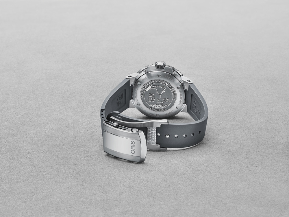 Крепление модели Oris Source of Life Limited Edition представлено в двух вариантах: на металлическом браслете из нержавеющей стали или на сером каучуковом ремешке. В обоих случаях предусмотрена раскладывающаяся застежка из нержавеющей стали с удлинителем, чтобы часы можно было надеть поверх гидрокостюма.