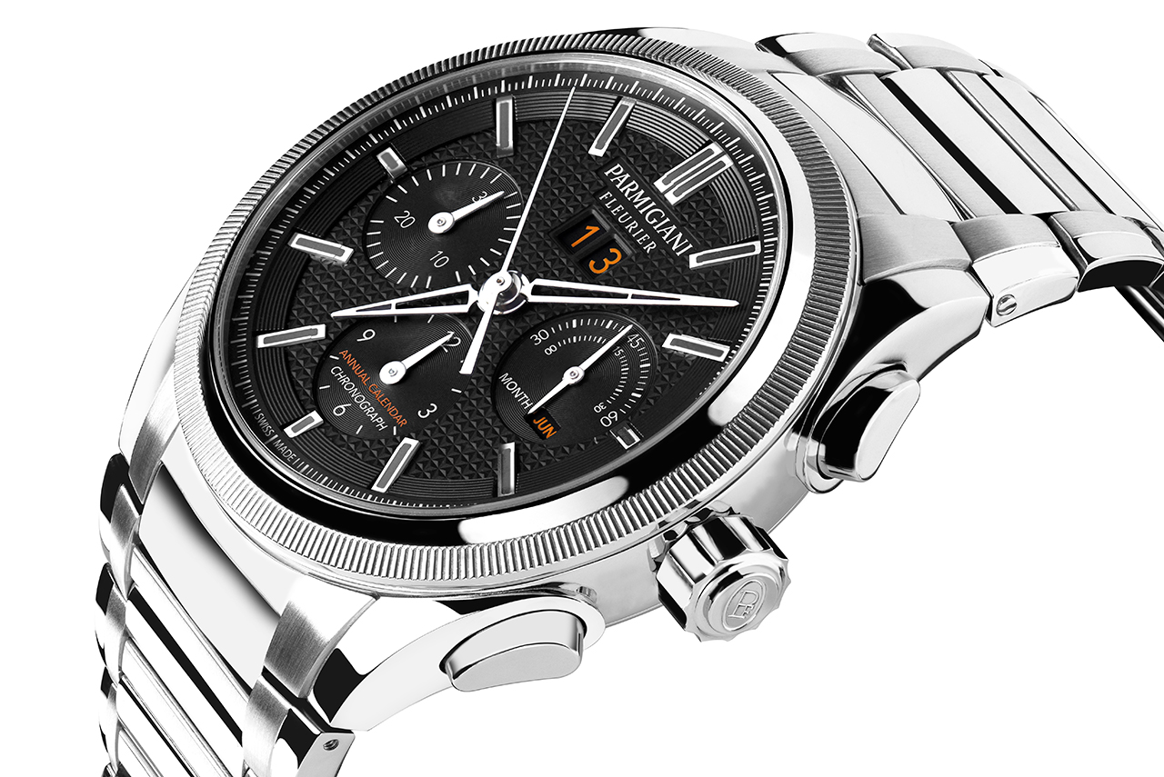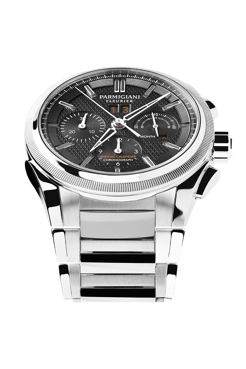 Модель Tondagraph GT работает на автоматическом калибре PF043 и обладает двумя самыми востребованными усложнениями: годовым календарем и хронографом. Этим необычным сочетанием функций Parmigiani Fleurier заполнила пробел в часовом мире, представив их в редком по уровню исполнения качестве и к тому же по исключительной цене. Циферблат изобилует указателями, но при этом легко читается. В наличии дельтовидные часовая и минутная стрелки с черным люминесцентным покрытием, малый секундный счетчик, два накопителя хронографа и большое окно указателя даты на «12 часах». Для привлечения внимания к функции годового календаря дата и месяц показываются ярким оранжевым цветом. Эти впечатляющие часы водонепроницаемы до 100 метров, имеют завинчивающуюся заводную головку, а их механизм с 45-часовым запасом хода, открытый для обзора со стороны задней крышки, украшен узором «Женевские Полосы». Тираж Tondagraph GT ограничен 200 экземплярами.