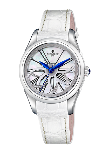 Изысканно-изящные модели женских часов «Perrelet Diamond Flower Amytis» с контрастной цветовой палитрой, драгоценными камнями и визуальной магией двойного ротора комплектуются кожаными ремешками белого и чёрного цвета, и снабжены надёжной клипсовой застёжкой из нержавеющей стали.