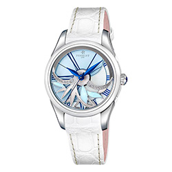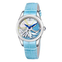 Циферблаты выполнены в двух вариантах: синим, с акцентом из белого перламутра и светло-голубым с фиолетово-синими римскими цифрами. Модель комплектуется кожаным ремешком из кожи аллигатора или стальным браслетом, в зависимости от цветовой гаммы. Часы сочетают в себе художественное ремесло и современное часовое искусство, что делает их идеальным выбором для женщин с безупречным вкусом.