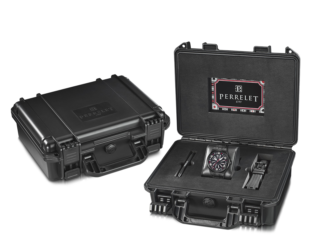 Запатентованная в 2009 году технология Turbine, по которой и названа коллекция, вдохновлена авиационными и морскими силовыми установками. Вращающаяся турбина состоит из 12 лопастей из черного анодированного алюминия и пять противовесов из вольфрама. Сборка устройства требует выверенных компонентов для бесперебойной работы. Вечное вращение турбины, символ Perrelet, оживает на циферблате благодаря мастерству часовщиков компании.