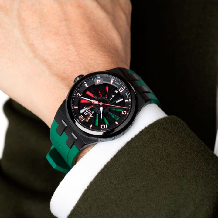 - Циферблат: Черный с лопастями турбины, мексиканским флагом и надписью «Viva México, cabrones!», красные арабские цифры и индексы с белым Super-LumiNova