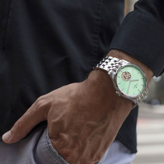 - Циферблат: Куполообразный, зелено-мятный или лососевый оттенок, открытый балансир в позиции «6 часов».
