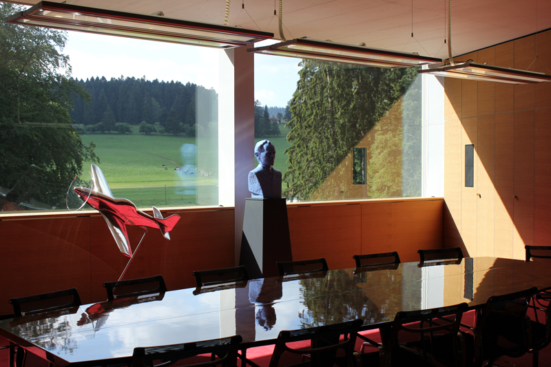После авиашоу - конечно, не в тот же день, чтобы не смешивать впечатления - мы посетили фабрику Breitling в Ля Шо-де-Фон и штаб-квартиру Breitling в Гренхене. Всех потрясли виды из окон переговорных и производственных помещений фабрики. Знаете, в рекламах часто красиво рассказывают о том, как «тихими долгими вечерами швейцарцы в горах собирают часы» - так вот, за исключением долгих вечеров, это правда. За окнами переговорной комнаты виднелись склоны гор, альпийские луга с нежно-зеленой травой, которую мирно щипали породистые швейцарские буренки. Мы перешли в цех - и что же, в окне, разумеется, виднелись те же луга и коровы. Вид - как будто ты находишься в отеле среди гор, а вовсе не на работе - если бы не специалисты в белых халатах. Поскольку производство часов предполагает идеальную чистоту и отсутствие пыли, то каждый час в помещениях полностью меняется воздух - на свежий и чистый.