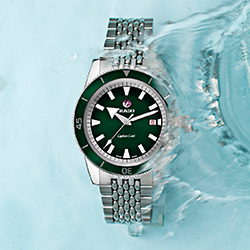 - вращающийся безель из нержавеющей стали со вставкой из полированной зеленой высокотехнологичной керамики, на которой выгравированы металлизированные цифры и метки;