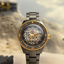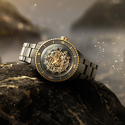 Rado Captain Cook (R32190153) в этой линейке представлен в новом образе: корпус и браслет из матовой чёрной высокотехнологичной керамики, заводная головка и частично безель из нержавеющей стали с покрытием розового золота, внутренний безель из полированной черной керамики. Сквозь дымчатый скелетонизированный циферблат видно автоматический калибр R808 с декором «женевские волны» (Côtes-de-Genève) и 25 камнями. Модель выглядит мощно и современно, сохраняя дух исторического дайвера как идеальный вариант для тех, кто выбирает спортивную роскошь.