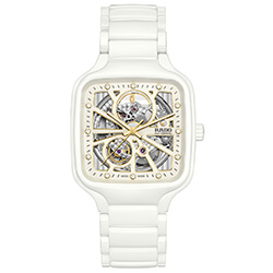 Rado True Square Open Heart (R27073722) - светлая праздничная противоположность. Белая высокотехнологичная керамика, мягко закруглённый квадратный корпус и полностью открытое «сердце» механизма R734 Open Heart создают ощущение воздушности. Сквозь сапфировое стекло на циферблате и в титановой задней крышке можно видеть перламутрово-белую платину и украшенный «женевскими волнами» держатель механизма. Лёгкий керамический браслет с шелковистой фактурой делает модель особенно приятной в повседневной носке.