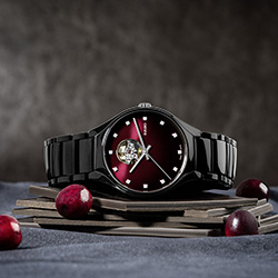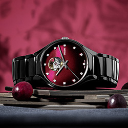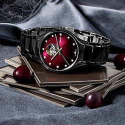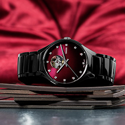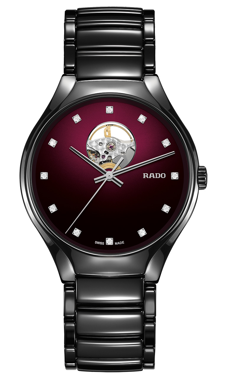 В часах Rado True Secret Ceramic безупречность керамики черного цвета объединяется с чувственным красным — цветом любви. Красный цвет присутствует на циферблате в виде мерцающих оттенков от темно-вишневого до черного. Цветовой градиент от насыщенного к более светлому подчеркивает мистическую ауру этих часов, чей секрет становится явью на 12-часовом делении. Сквозь маленькое круглое отверстие открывается часовой механизм: чутко сбалансированный и живой.