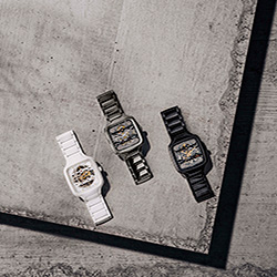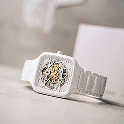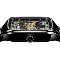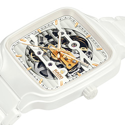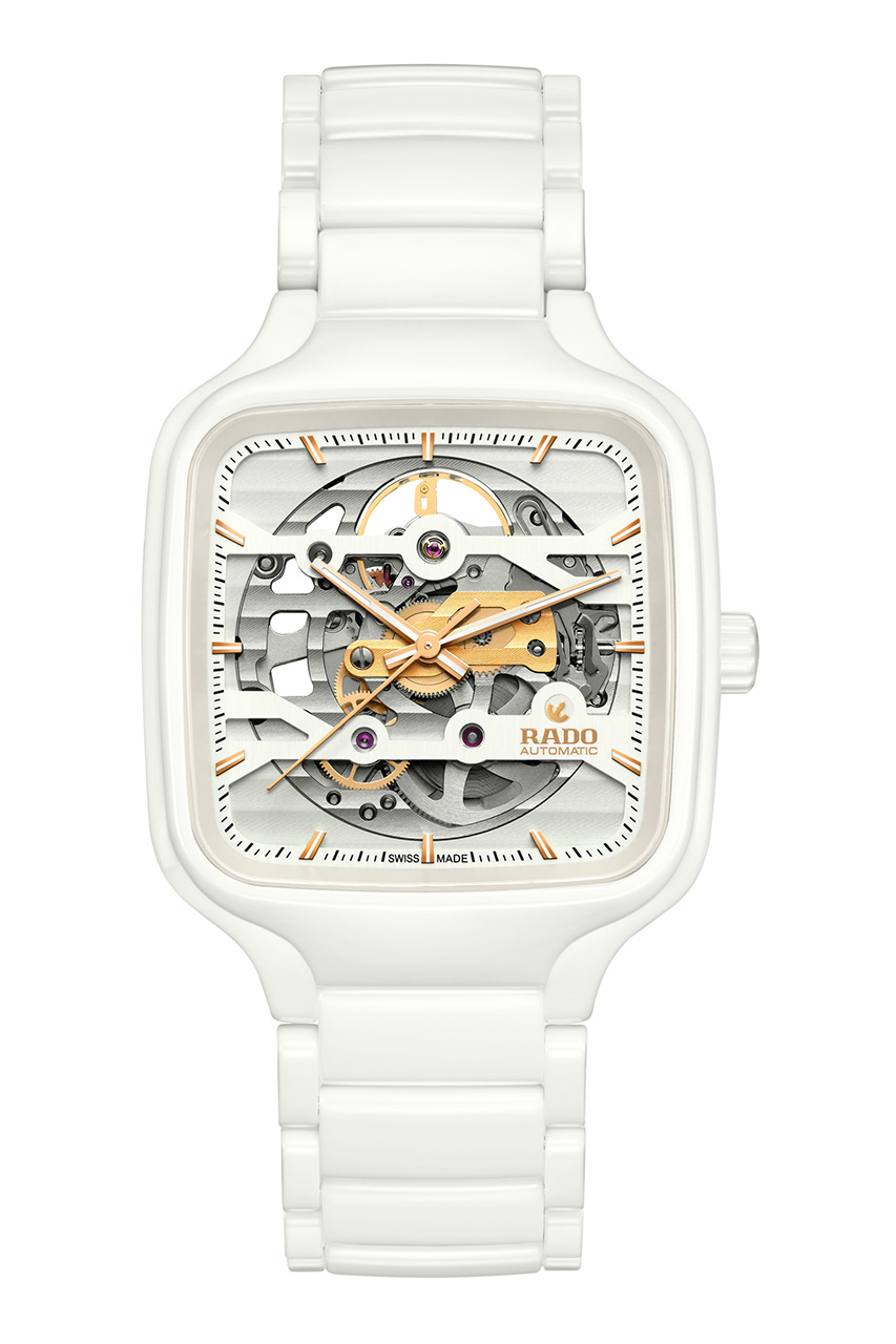 Настоящий квадратный скелет сохраняет культовый квадратный вид, который долгое время тесно ассоциировался с Rado, дополненный великолепным примером «искусства скелетонирования». Все ссылки отражают четкий, сдержанный дизайн коллекции. Параллельные горизонтальные линии делят циферблат на три части, подчеркивая геометрическую гармонию и ключевые детали механизма. Верхняя часть привлекает внимание к сердцевине часов – балансу и пружине NivachronTM, в то время как в центральной части представлены стрелки, мост минутного колеса и драгоценные камни механизма, а в нижней части – корпус, связанный с запасом хода. Черные, плазменные и белые моноблочные футляры из высокотехнологичной керамики сочетаются с высокотехнологичными браслетами ceramic link тех же оттенков для обеспечения исключительного комфорта, легкости и красоты.