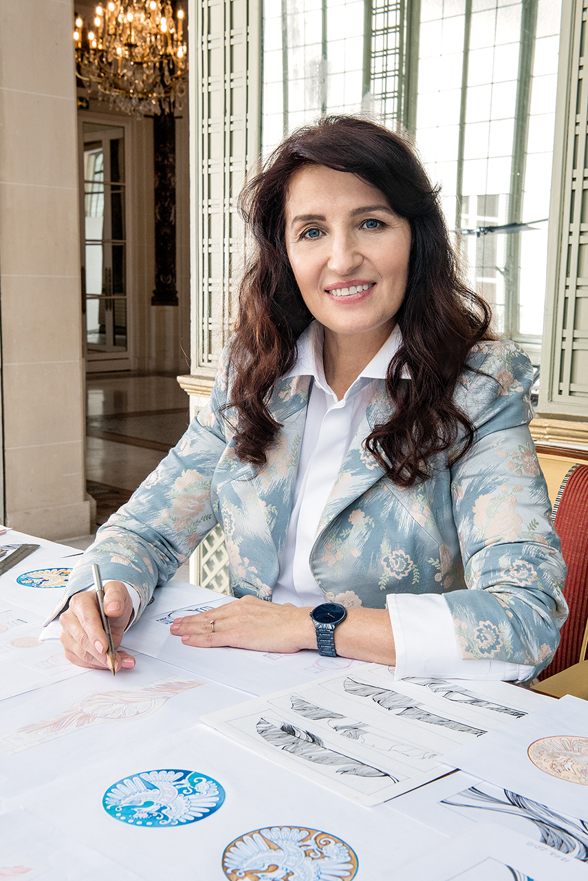 Евгения считает, что птица является символом изысканности, мудрости и женственности, а также свободы. Поэтому изображение птицы расположено на задней части корпуса часов. Символ птицы, выбранный дизайнером, смотрится роскошно и благородно за счет красных и позолоченных перышек. Эти цвета ассоциируются с теплом и светом — образами, которые часто фигурируют в работах Евгении. Рисунок птицы нанесен на заднюю часть корпуса из сапфирового стекла при помощи цифровой печати — такой прием используется компанией Rado впервые.