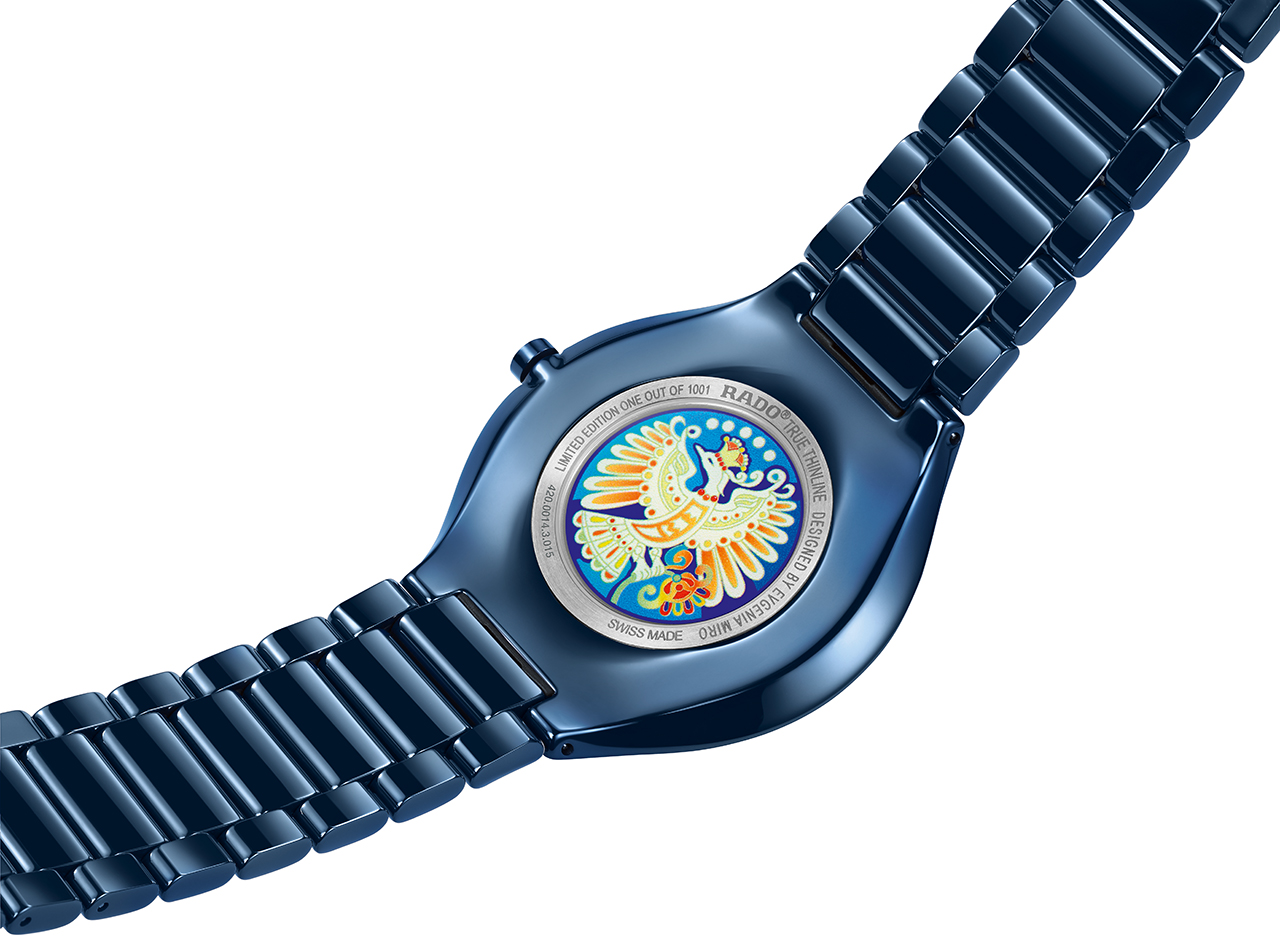 Компания Rado, знаменитая своими инновациями, предложила русскому художнику и дизайнеру Евгении Миро привнести в дизайн новых часов свое видение и идеи. В результате тесного сотрудничества созданы часы, которые пополнили революционную коллекцию True Thinline, известную благодаря своему тонкому силуэту.