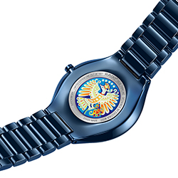 - Задняя крышка корпуса из титана с печатным изображением птицы на сапфировом стекле.
