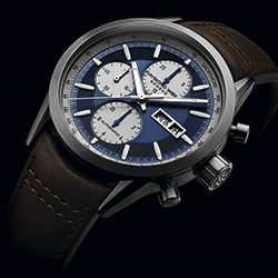 Новый хронограф Freelancer оформлен в винтажном стиле и заключен в круглый корпус диаметром 42 мм из нержавеющей стали с PVD-покрытием цвета титана с окошком даты в положении «3 часа» и тахиметрической шкалой по периметру циферблата. Циферблат темно-синего цвета с сатинированием контрастирует с тремя светлыми счетчиками хронографа и дополнен заметными никелированными индексами, идеально сочетающимися с тонкими стрелками. Стрелки и индексы с покрытием Super-LumiNova® обеспечивают полную читаемость в темноте. Циферблат защищен сапфировым стеклом с двусторонним антибликовым покрытием, обеспечивающим максимальную прочность.