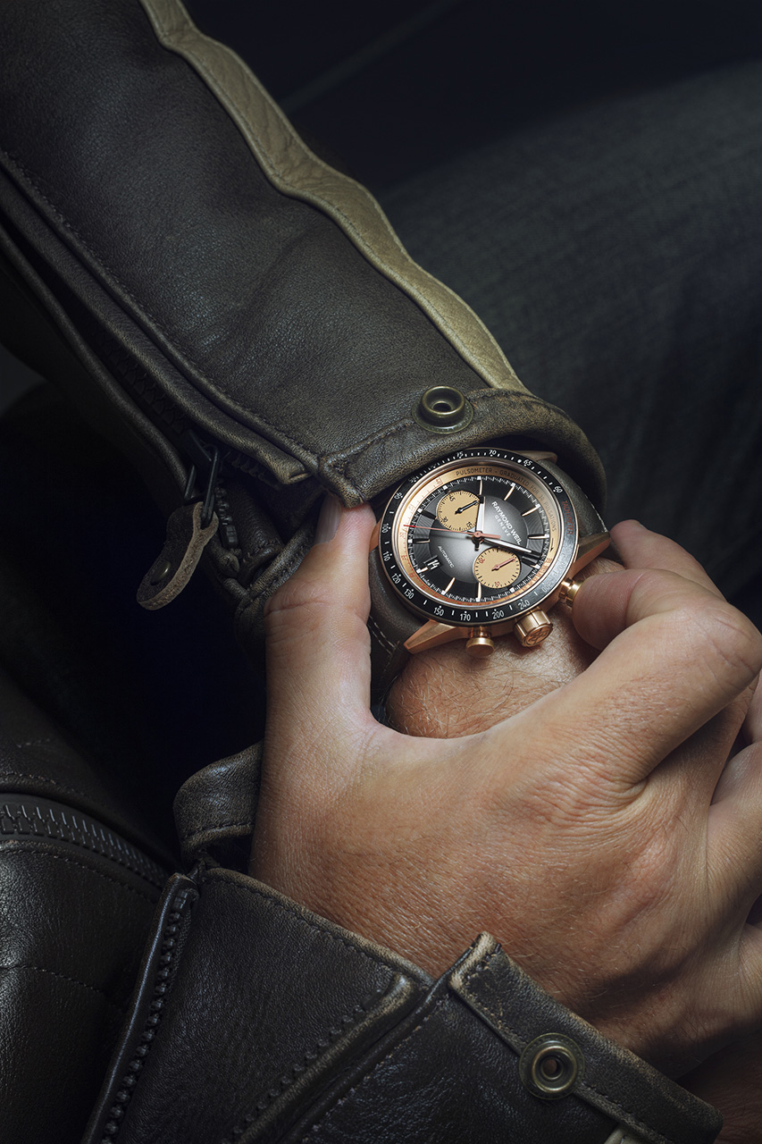 Шкалы тахиметра и пульсометра, выгравированные на крышке бака мотоцикла, воспроизведены на сатинированном керамическом безеле и по краям циферблата часов соответственно. Даже ремешок из телячьей кожи насыщенного коричневого цвета был вдохновлен сиденьем мотоцикла, обтянутым кожей. Очевидно, что различные детали мотоцикла, изготовленного на заказ, послужили источником идей для новых часов марки, вдохновленных винтажным стилем.