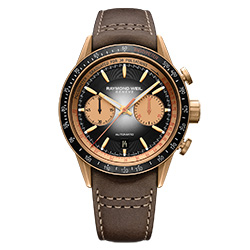 На кастомизированном мотоцикле марки Meister Engineering надпись RAYMOND WEIL украшает топливный бак, где логотип изображен на фоне цвета розового золота. Это послужило источником вдохновения для 43,5 миллиметрового бронзового корпуса и двух счетчиков хронографа. Аналогичным образом краска мотоцикла с эффектом градиента повлияла на черный дымчатый циферблат часов. Последняя деталь придает циферблату интересный вид: светлые тона в центре циферблата переходят в более темный оттенок у края.