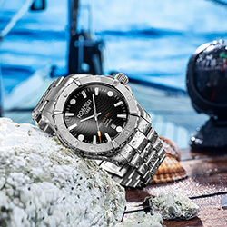 Модель DEEP SEA 200 оснащена сапфировым стеклом с антибликовым покрытием и 43-миллиметровым корпусом из нержавеющей стали в форме круга, в котором установлен надежный высококачественный кварцевый механизм швейцарского производства. Декоративный волнистый циферблат серебристого, черного или синего цвета привлекает внимание любителей как спортивного стиля, так и классики. Корпус и браслет выполнен из нержавеющей стали 316L.