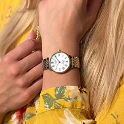 Круглый серебряный циферблат отличается сбалансированными пропорциями и лаконичным дизайном, сочетающим две центральные стрелки современного синего цвета с миниатюрной секундной стрелкой в положении «6 часов». Римские цифры черного цвета обрамлены безелем из золота или розового золота. Соответствующий металлический тон подобран в заводной головке и в двухцветном дизайне цельного браслета.