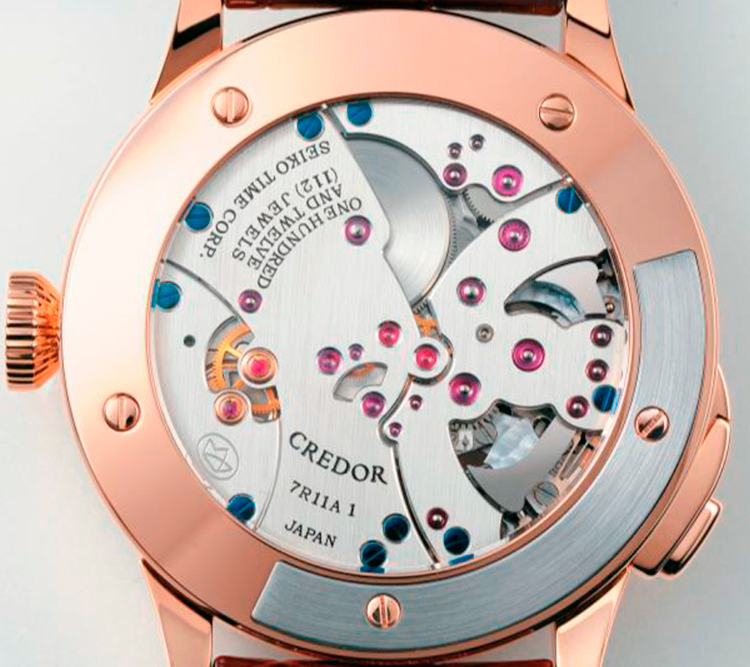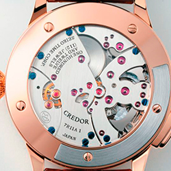 В составе Credor Spring Drive Minute Repeater свыше 660 компонентов. Все основные части механизма тщательно отполированы вручную высококлассными мастерами часовой студии Micro Artist. Изящество их работы доступно невооруженному взгляду сквозь сапфировое стекло с лицевой стороны часов и прозрачную крышку с обратной стороны корпуса. Особого внимания заслуживают завораживающая красота лезвий бесшумного регулятора с фронтальной стороны часов и бой молоточков, которые можно увидеть сквозь прозрачную заднюю крышку.