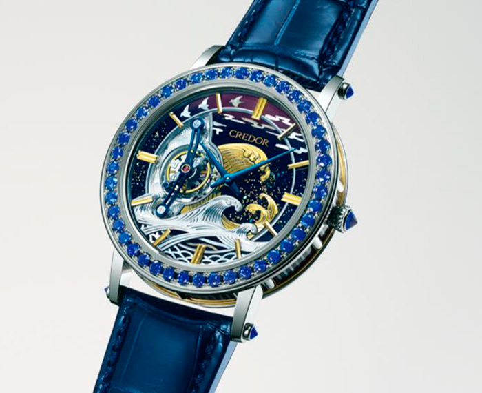 Уникальный цвет модели Fugaku появился благодаря сочетанию гравировки и лака Уруси. Сцена на циферблате напоминает небо во время рассвета, подчеркнутое цветовым градиентом – от темно-синего до фиолетового. Чтобы добиться этого мастер Иссю Тамура применил сложные техники лакового искусства и передал все оттенки лака Уруси, толщина слоя которого всего 0,1 мм. Также он нанес эмблему Credor золотым японским лаком.