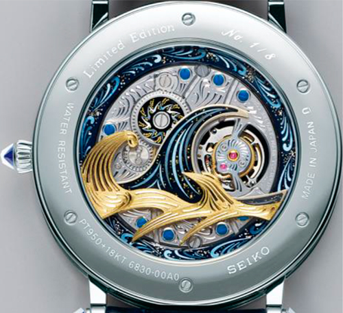 Работа из натурального перламутра украшает циферблат японским традиционным узором Сейгайха (изображение волн) у отметки «6 часов» и изображением облаков, птиц возле отметки «12 часов». Каждый часовой индекс выполнен из 18-каратного желтого золота.