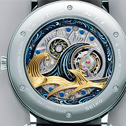«Тридцать шесть видов горы Фудзи» – это серия работ знаменитого японского художника Кацусики Хокусай, известная во всем мире и представляющая собой икону японской культуры. Написанная в XIX веке в период Эдо, «Большая волна в Канагаве» принесла Хокусай всемирную известность благодаря поразительно динамичной композиции, исполненной в перспективе. Изысканность гравированного циферблата завораживает. Мастер Киёси Тэруи работал на пределе своего технического мастерства, чтобы вдохнуть жизнь в трехмерную миниатюру волн – главную сцену, изображенную на циферблате часов. Максимальная толщина волн, изготовленных из 18- каратного желтого и белого золота, составляет 1,6 мм, а минимальная толщина – всего 0,5 мм. Это можно назвать чудом ручного ремесленного труда.