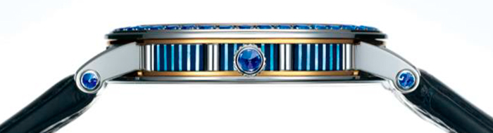Платиновый корпус диаметром 43 мм украшен синими сапфирами, которые гармонично сочетаются с цветовым градиентом циферблата. Боковые части корпуса инкрустированы вставками из натурального перламутра, которые завершают изысканную и сложную отделку корпуса.