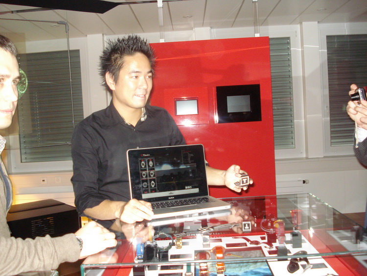 Во-вторых, доску можно использовать и для "примерки" новинок. Вот как это происходит. На руке у техника обычная "бумажная" модель. Вы надеваете ее на руку, подносите к экрану, выбирается модель - любую! - и нажимается на клавишу. В итоге модель полностью, включая объем, проецируется на экране: вы видите себя как в зеркале - с новой моделью часов, вы можете оценить, как эта модель выглядит со стороны и подходит ли она вам. Отличный способ выбрать подходящую модель из тех, которых еще нет в городе и проверить, как одна и та же модель будет смотреться на разных запястьях.