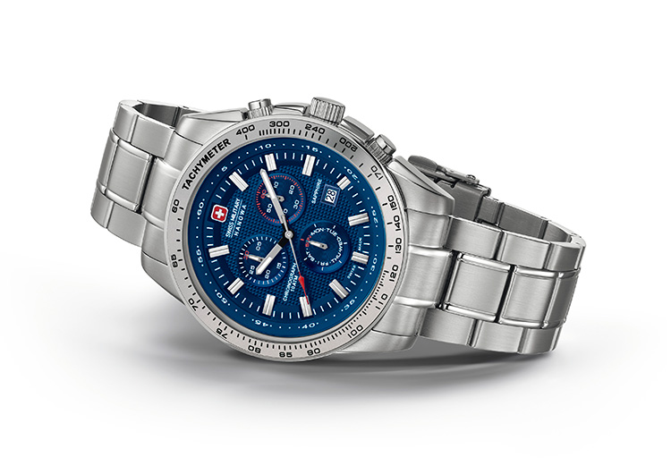 6. Swiss Military Hanowa Crusader Chrono 6-5225.04.001.03: корпус из нержавеющей стали 316L, безель с ионным покрытием синего цвета и тахиметрической шкалой, белый циферблат с часовыми индексами синего цвета, браслет из нержавеющей стали. | |