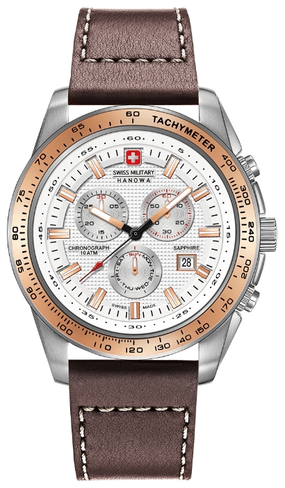 2. Swiss Military Hanowa Crusader Chrono 6-4225.04.001.09: корпус из нержавеющей стали 316L, безель с ионным покрытием розовой позолотой и тахиметрической шкалой, белый циферблат с часовыми индексами цвета розового золота, коричневый кожаный ремешок с белой прострочкой. | |