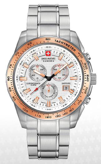 7. Swiss Military Hanowa Crusader Chrono 6-5225.04.001.09: корпус из нержавеющей стали 316L, безель с ионным покрытием розовой позолотой и тахиметрической шкалой, белый циферблат с часовыми индексами цвета розового золота, браслет из нержавеющей стали. | |