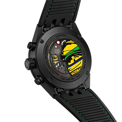 Скелетонизированный циферблат, акценты в жёлто-зелёных цветах и чёрный каучуковый ремешок со строчкой в цветах бразильского флага делают модель мощной, эффектной и глубоко символичной. Это выбор для тех, кто стремится выделяться и не боится рисковать — как и сам Сенна.
