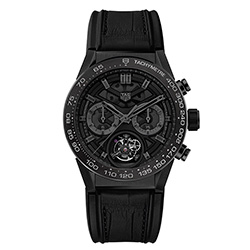2. TAG Heuer Carrera Heuer-02T Tourbillon «Black Phantom» Limited edition CAR5A8Z. FC6377: модель «all black» ограниченной серии в количестве 250 индивидуально пронумерованных экземпляров: титановый корпус с чёрным покрытием из карбида титана всех его металлических элементов, чёрный керамический безель с серой тахиметрической шкалой; чёрный циферблат с условными часовыми индексами, стрелками и счётчиками хронографа из титана чёрного цвета, с серой надписью «COSC» между отметками «8 и 9 часов»; чёрный кожаный ремешок, титановая раскладывающаяся застёжка с чёрным покрытием из карбида титана, предохранительными кнопками и символом марки «TAG Heuer». | |