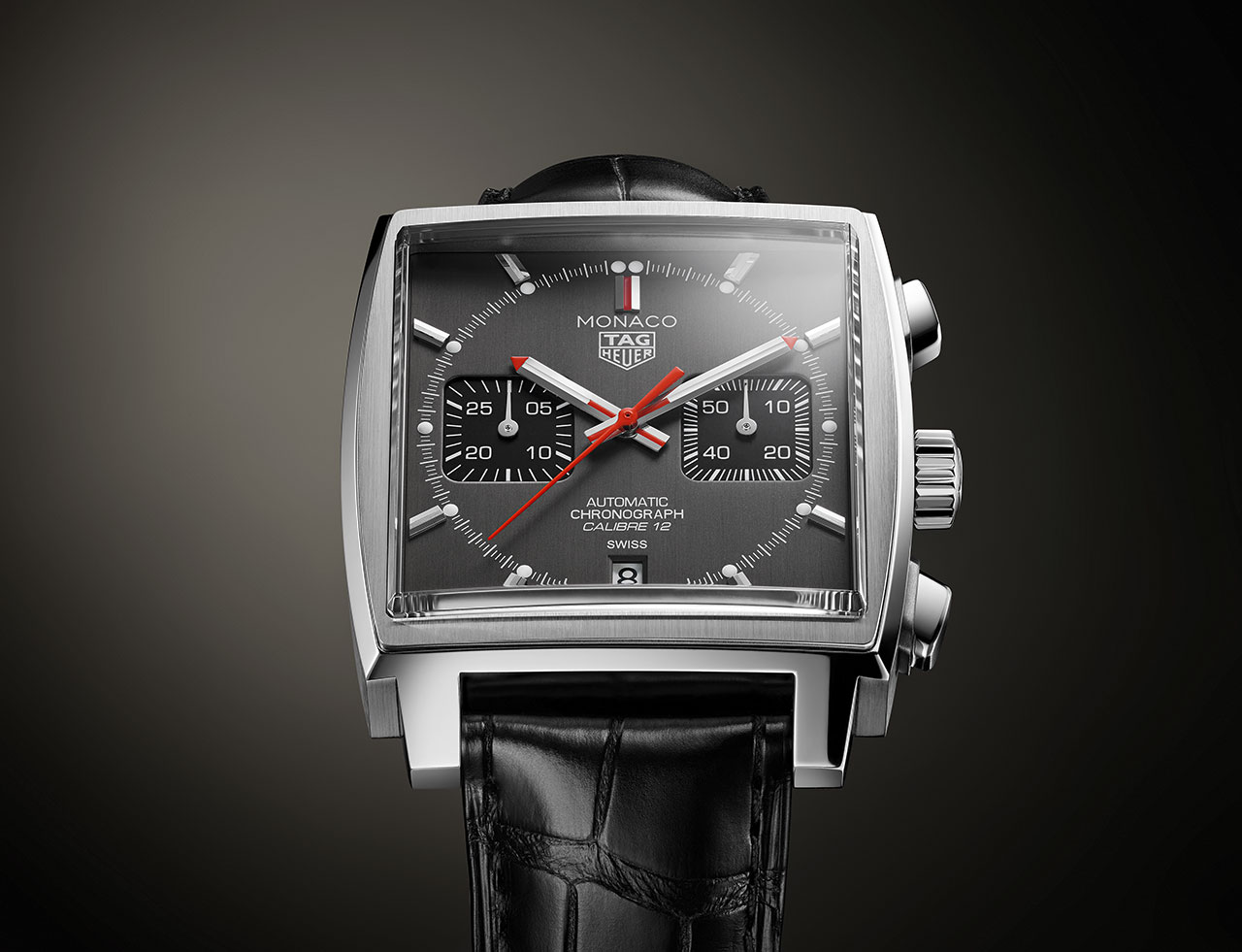 В отличие от изначального механизма Monaco Calibre 11 новый Calibre 12 обновил внешний вид знаменных часов. Теперь заводная головка расположена с правой стороны корпуса – вместо левой, как это было с Calibre 11. TAG Heuer представляет последнюю модель Calibre 12 Monaco с потрясающим серым циферблатом. Модель из нержавеющей стали оснащена классическим черным ремешком из кожи аллигатора с матовым рутениевым циферблатом. Рутений является частью платиновой группы и переливается разными оттенками в зависимости от источника света. Гладкие черные опаловые счетчики в позициях 3 и 9 часов создают изысканный контраст с матовым циферблатом. Центральная секундная стрелка, 12-часовой указатель и кончики часовой и минутной стрелок ярко-красного оттенка подчеркивают современный стиль этой легендарной модели. Всего выпущено 1000 экземпляров Monaco Calibre 12 Final Edition, а на корпусе из нержавеющей стали каждой модели выгравирован ее лимитированный номер. (6,7)