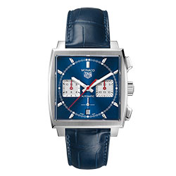 Часы Monaco Heuer 02 из нержавеющей стали представлены с синим PVD циферблатом с эффектом sunray, на темно-синем ремешке из кожи аллигатора с темно-синей прострочкой. Циферблат оснащен обновленными счетчиками из серебра и опала в позициях 3 и 9 часов, а также восемью трехгранными индексами и новым постоянным вторым индикатором над датой в позиции 6 часов. Красные акценты на центральной секундной стрелке и стрелки хронографа подчеркивают спортивный дизайн часов. Точный калибр механизма Heuer 02 обладает впечатляющим запасом хода – 80 часов. Интегрировав этот механизм в Monaco, TAG Heuer объединил один из своих самых знаковых продуктов с передовыми достижениями в часовом деле.